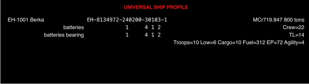 The BeRKA is a TL-14 800 ton needle/wedge hull starship with a jump drive-3, a maneuver drive-4, and a power plant-9 producing 72 energy points. It is capable of Agility-4.