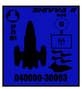 The Shivva II Class Colonial Patrol Corvette is a TL-13 600 ton cone hull starship with a jump drive-3, a maneuver drive-4, and a power plant-7 producing 42 energy points. It is capable of Agility-4.