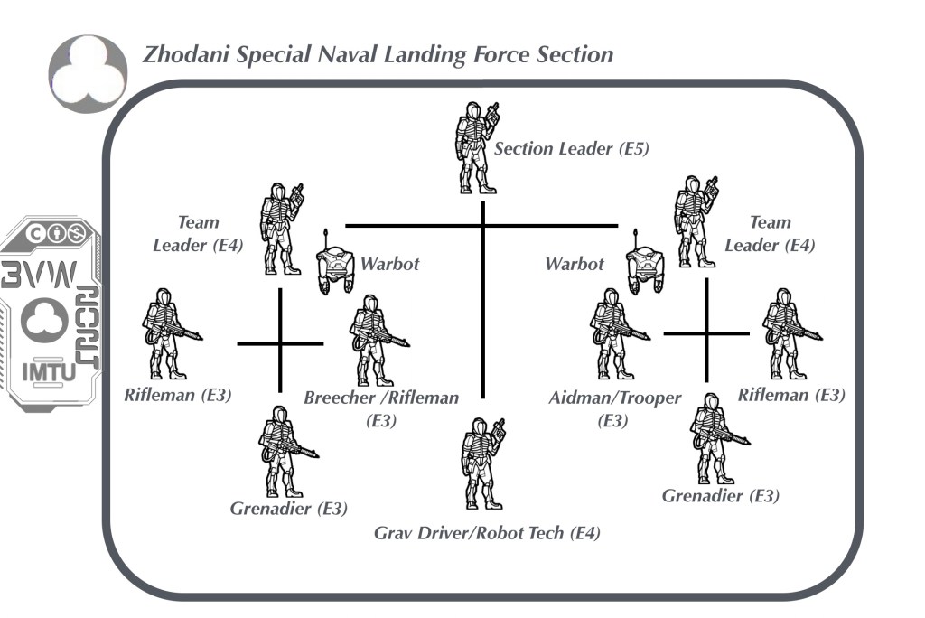 The Zhodani Naval Special Landing Forces are not a separate branch or service within the Zhodani Combined Interstellar Forces. They are specially selected, trained, and equipped members of the Consulate Navy. The ZNSLF is tasked with supporting fleet operations and securing the Consulate’s naval facilities. ZSNLF Squadrons (Battalions) are formed to seize, construct, and secure naval bases. The ZNSLF is uniformly trained to operate in hostile environmental conditions such as vacuums, exotic atmospheres, and zero-gravity environments.