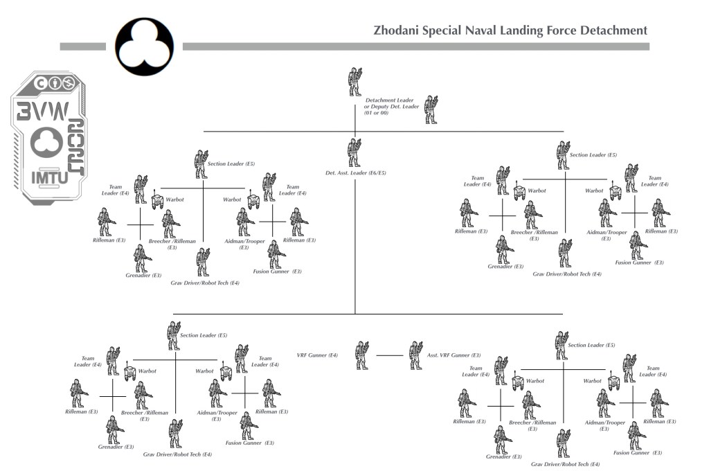 The Zhodani Special Naval Landing Force is usually encountered in the small ship detachments exhibited below. The Troop is a large formation of two detachments and a command section. A squadron contains a Headquarters and Services Troop, four to six ZSNLF Rifle Troops, a Lift Cavalry Troop, and a Weapons Troop with Indirect Fires and Point Defense sub-units. The largest ZSNLF is at the fleet level, usually containing a Headquarters Troop, four to six ZSNLF squadrons, and logistics and Support Troop. These units are rarely consolidated unless needed for more significant operations